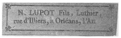 LUPOT (François). - Né à Orléans en 1774, mort à Paris le 4 février 1837 - frère de Nicolas Lupot, le grand luthier. Il se livra exclusivement à la facture des archets. Ses ateliers, situés rue d'Angivilliers, n° 18, y restèrent de 1815 à 1837, époque de sa mort. Dominique Peccate prit alors la suite de ses affaires. François Lupot a fait de beaux archets, qui ont conservé une certaine vogue. Ce fut lui, qui, le premier, a ajouté à la hausse ce qu'on appelle la coulisse, doublure en métal qui garnit la hausse dans la rainure fixée sur la baguette. Cette heureuse innovation a prévalu depuis.