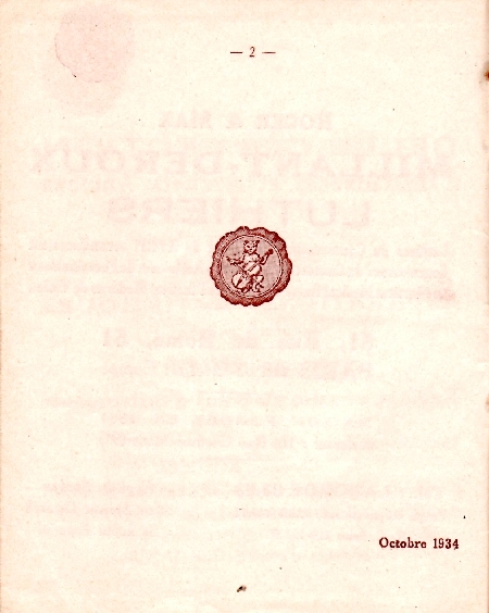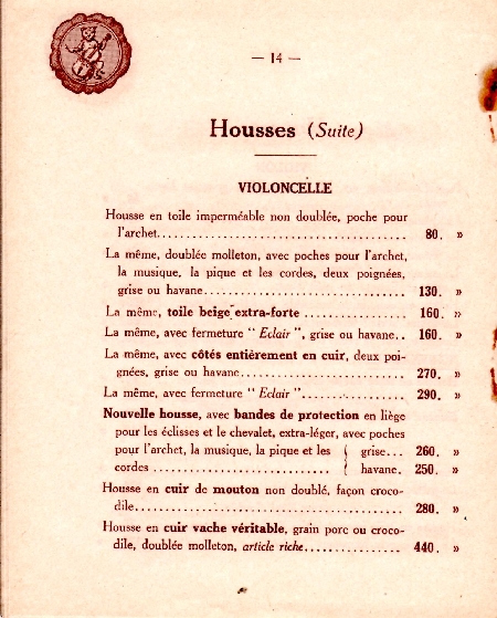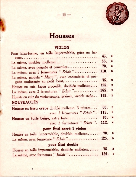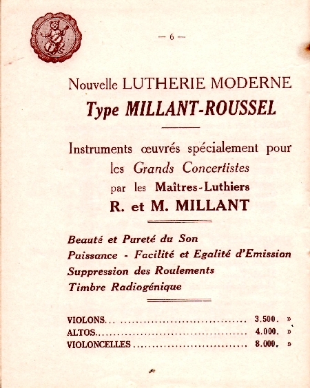catalogue Millant-Deroux 1934 Ce catalogue de 1934 nous a été aimablement communiqué par Randy Osborne que nous remercions une fois de plus chaleureusement. Cette illustre maison de lutherie était composée de Roger et Max Millant, tous deux fils de Léon Millant, caissier comptable et Blanche Georgette Deroux, fille du luthier Sébastien Auguste. Nous avons par ailleurs mis en ligne la généalogie des familles Deroux et Millant qu'il conviendra de consulter. Des photos d'un instrument de 1955 sont aussi disponibles sur ce site. Le dernier luthier descendant de cette famille est Bernard qui nous a quitté en 2017 et chez qui nombre de luthiers ont été salariés. Cette maison est continuée par M. et M. Le Canu, toujours à la même adresse rue de Rome. |